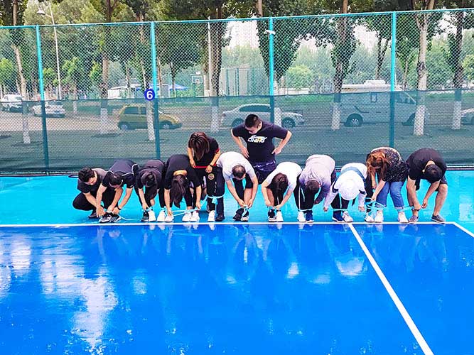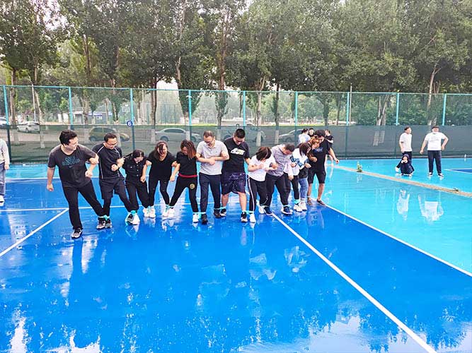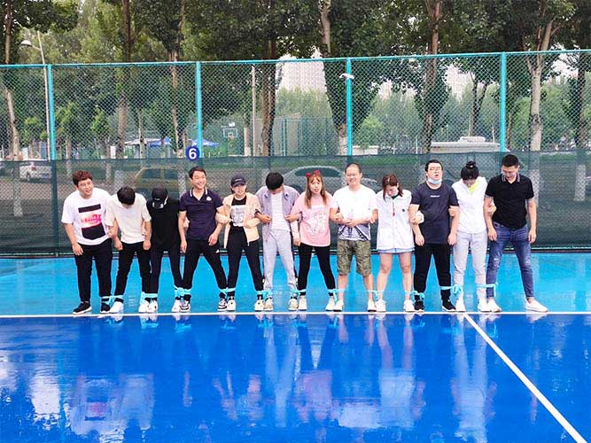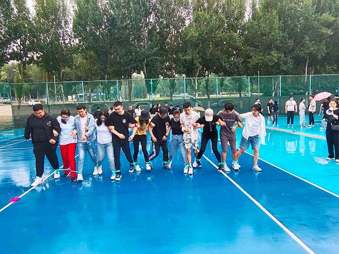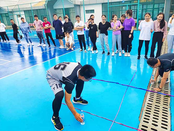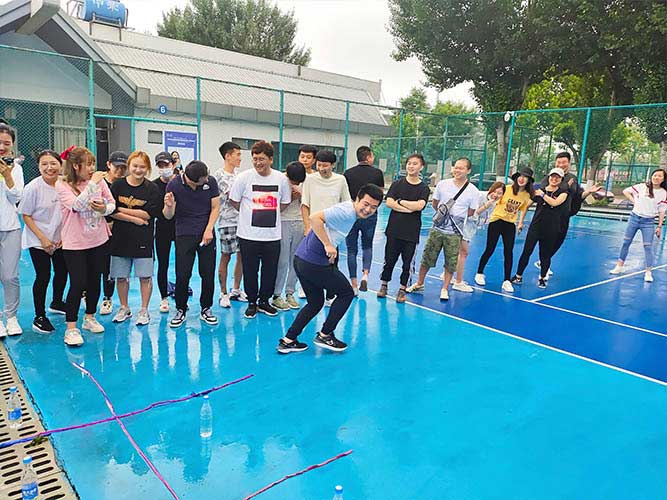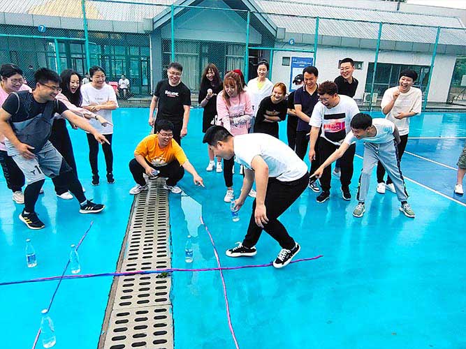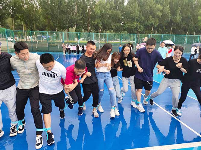 大家一排站好,從左到右,每人的右腿與另一人的左腿依次并齊,并用扁帶繩子系上,繩子綁的位置是腳踝以上部分。聽(tīng)見(jiàn)哨聲即為游戲開(kāi)始,從起點(diǎn)到終點(diǎn),按用時(shí)由短到長(cháng),取前五名依次加分。